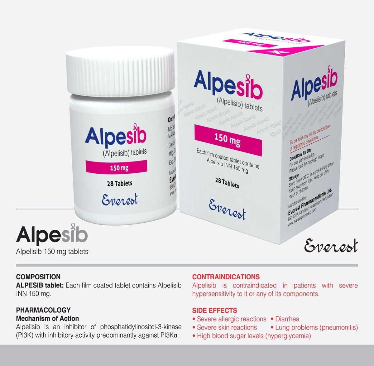 - Thuốc Alpesib 150mg (Alpelisib) được nghiên cứu và sản xuất bởi các chuyên gia của hãng dược Everest Bangladesh đây là hãng dược phẩm lớn trên thế giới, cung cấp các thuốc biệt dược điều trị bệnh hiệu quả