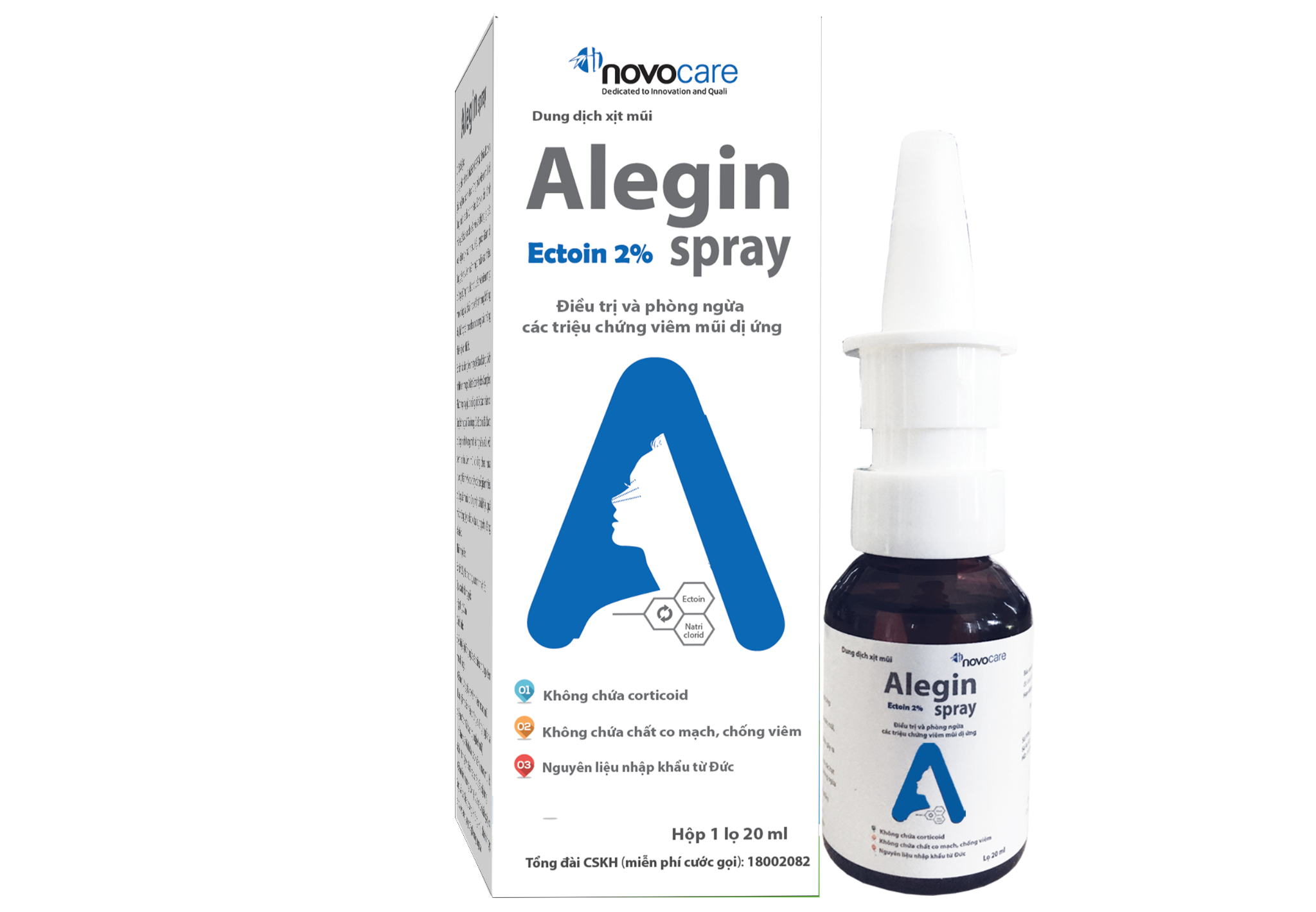 Dung dịch xịt mũi Alegin Spray chứa Ectoin, giúp giảm các triệu chứng của viêm mũi dị ứng một cách tự nhiên. Ectoin ổn định màng tế bào do đó bảo vệ và chống lại các loại phản ứng khác nhau. Hiệu quả: Giảm dị ứng gây ra viêm niêm mạc mũi, các triệu chứng dị ứng như hắt hơi , bảo vệ niêm mạc mũi, chống lại phấn hoa và hạt trong không khí, hỗ trợ tái tạo nhanh chóng các màng nhầy bị kích thích.