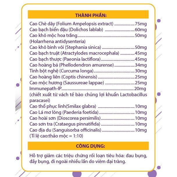 Hỗ trợ giảm các triệu chứng rối loạn tiêu hóa: đau bụng, đầy bụng, đi ngoài nhiều lần do viêm đại tràng