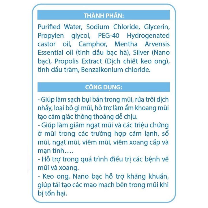 Purified Water, Sodium Chloride, Glycerin, Propylen glycol, PEG-40 Hydrogenated castor oil, Camphor, Mentha Arvensis Essential oil (tinh dầu bạc hà), Silver (Nano bạc), Propolis Extract (Dịch chiết keo ong), tinh dầu tràm, Benzalkonium chloride.