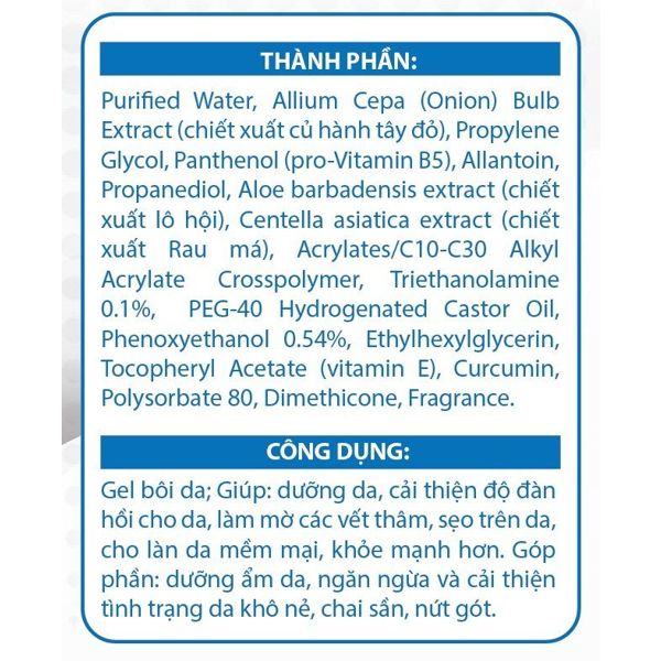 Purified Water, Allium Cepa (Onion) Bulb Extract (chiết xuất hành tây đỏ), Propylen glycol, Panthenol (pro-Vitamin B5), Allantoin, Propandiol, Aloe barbadensis extract (chiết xuất lô hội), Centella asiatica extract (chiết xuất Rau má), Acrylates/C10-C30 Alkyl Acrylate Crosspolymer, Triethanolamine, PEG-40 Hydrogenated Castor Oil, Phenoxyethanol, Ethylhexylglycerin, Tocopheryl Acetate (vitamin E), Curcurmin, Polysorbate 80, Dimethicone, Fragrance.