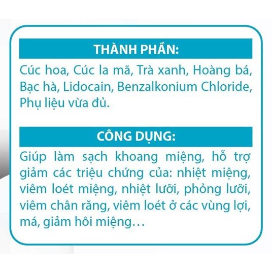Giúp làm sạch khoang miệng, hỗ trợ giảm các triệu chứng của: nhiệt miệng, viêm loét miệng, nhiệt lưỡi, phỏng lưỡi, viêm chân răng, viêm loét ở các vùng lợi, má, giảm hôi miệng…
