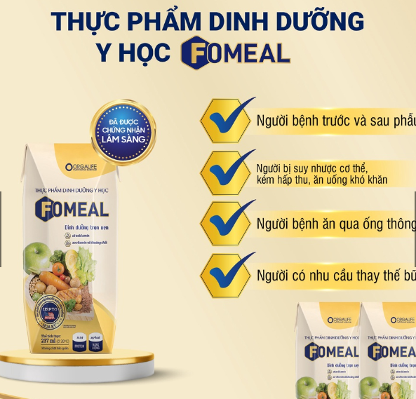 Thực phẩm dinh dưỡng Y học Fomeal là sản phẩm dinh dưỡng chuyên biệt cho người bệnh ăn qua ống thông; cung cấp dinh dưỡng cân bằng với năng lượng chuẩn (1 kcal/ml) từ nguồn nguyên liệu trọn lành từ thiên nhiên, phối hợp Peptide và MCTs dễ hấp thu, giúp cải thiện dung nạp cho người bệnh, bổ sung 20 vitamin và khoáng chất cần thiết giúp cơ thể hồi phục và tăng cường sức khỏe. Sản phẩm được cấp bằng độc quyền sáng chế bởi Cơ quan Sáng chế và Nhãn hiệu Hoa Kỳ (USPTO) và Cục Sở hữu trí tuệ Việt Nam (NOIP). Sản phẩm được sản xuất, kiểm soát bởi hệ thống quản lý chất lượng an toàn thực phẩm theo tiêu chuẩn Châu Âu FSSC 22000 và HACCP codex.
